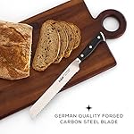 CAN YOU IMAGINE SLICING WITH THIS?: Your new 8 inch Bread Knife has a 5” curved ergonomic handle for a comfy grip, and in balance with your serrated 2.1mm blade. The tines are pointy and sharp – designed to saw crusts and soft bread without the friction that tears and crumbs. Sharp, weighs 7oz.