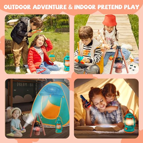 Battery Powered Kids Camping Gear Toys: A true-to-life campfire with extendable stand and oil lantern can light up with 3 AA batteries (not included) and adjust the binoculars to see the world.