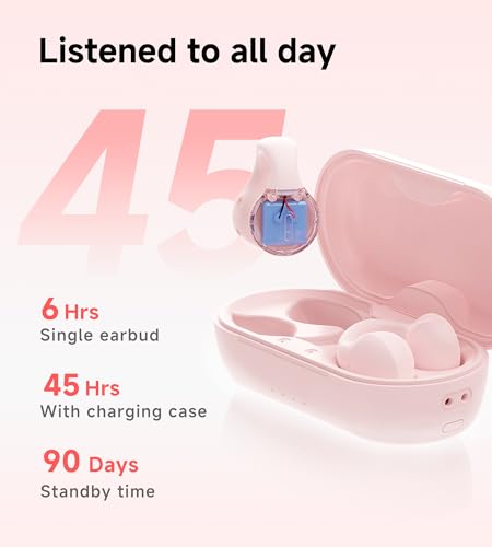 All-Day Listening Experience Never miss a beat with our clip-on wireless earbuds. Enjoy 8 hours of continuous playtime on a single charge, and extend your listening pleasure to 45 hours with the charging case. With a 90-hour standby time, our ear clip headphones are perfect for running, sports, and any adventure you embark on. Experience uninterrupted music like never before.