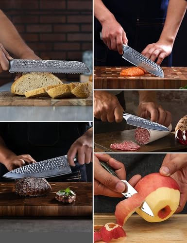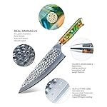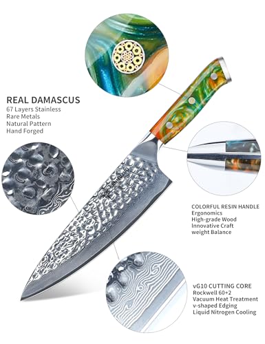 Premium Blade: The precise blade is made of 67 layers of Damascus steel, the core layer is VG10 material, wrapped by 33 layers of high-quality high-carbon stainless steel layers on each side to ensure excellent strength, toughness and durability. The forged surface is polished to minimize drag for jelly-smooth cuts and enhanced non-stick performance