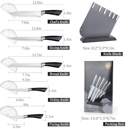 6-Piece Kitchen Knife Sets with Block: Our 6-piece knife sets for kitchen with block will fulfill your cooking needs; the kitchen knives sets includes 12.8” chef’s knife, 12.8” meat cleaver, 12.7” bread knife, 9.3” utility knife, 8” fruit knife and 9.1” knife block, so you can easily use them in the kitchen to accomplish any cooking task
