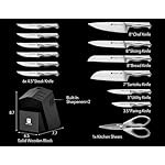 Full Tang Knife Set: Set includes 8″ chef’s knife, 8″ bread knife, 8″ slicing knife, 7″ Santoku knife, 5″ utility knife, 3.5″ paring knife, 6 pcs 4.5″ serrated steak knife, 1 kitchen shears, and modernist wooden knife block with 2-in-1 knife sharpener