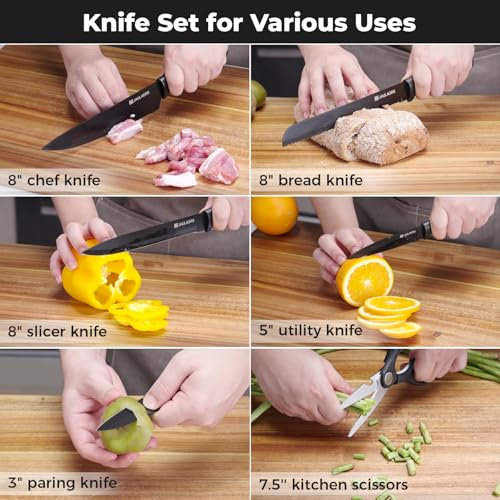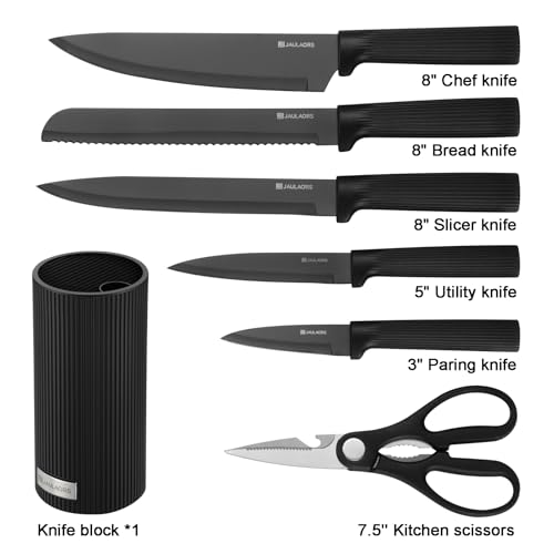 Ultimate Kitchen Collection All-in-One Set: The Jaulaors 7-Piece Knife Set includes everything you need: an 8″ chef knife, 8″ bread knife, 8″ slicer knife, 5″ utility knife, 3″ paring knife, 7.5″ kitchen scissors, and a knife holder. Crafted with precision, this set combines style with functionality for all your kitchen tasks