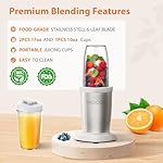 Multifunction Blender for Smoothies- We think what you think, and consider all aspects of you. We provide you with plenty accessories for you which contain 1* base, 1* 10oz/300ml grinding cup, 2* 17oz/500ml portable bottles, 1* 2-leaf blade, 1* 6-leaf blade, 1* sealing lid, 1* steam hole lid, 2* flip lid, 1* cleaning brush.