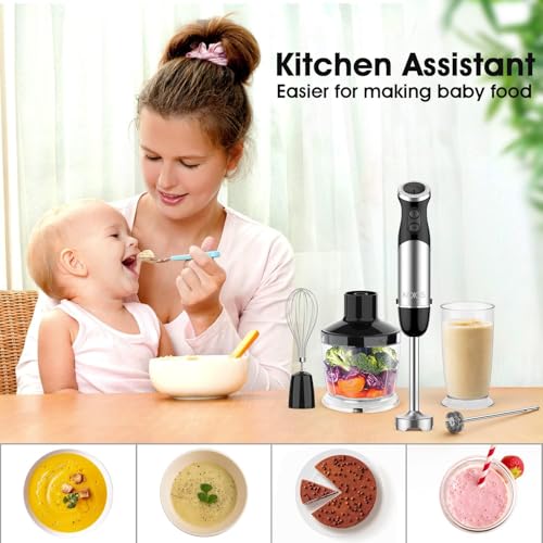 - 5 in 1 Multi-Purpose: The updated immersion hand blender sets is so great value for money, including Non-BPA 500ml chopper bowl, 600ml beaker, egg whisk and milk frother, ensures you easily to make a variety of foods.