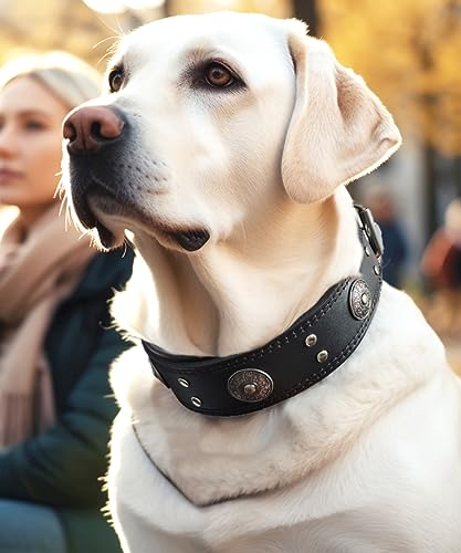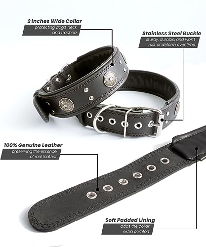Leather Dog Collar, 2 inches Wide Heavy Duty Genuine Leather Collars, Handmade, Soft, and Luxury, Eye-catching Best Choice for Large and Medium Breed Dogs, Black 19.5-23.5 inches