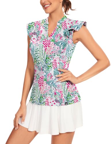 Soneven Womens Petal Sleeve Golf Shirts Moisture Wicking V Neck Athletic Workout Tennis Tops Quick Dry Golf Clothes $28.99