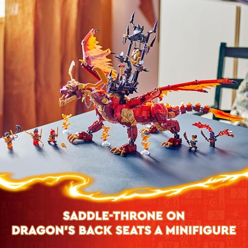 Kids ages 12 and up recreate soaring aerial adventures from season 2 of the NINJAGO Dragons Rising TV show with this awesome Source Dragon of Motion (71822) ninja playset. This is the biggest-ever LEGO dragon toy, and has posable legs, tail, hips, jaw, head, neck and large wings. It comes with a saddle-throne on its back and 6 smaller spirit dragons. This dragon toy set includes 6 minifigures for kids to play out battles: ninja warriors Kai, Wyldfyre and Arin (with cool sword and weapon accessories) and the villainous trio of Lord Ras, Jordana and a Wolf Mask Warrior, who each have their own weapon accessories. The LEGO NINJAGO range of sets and buildable ninja toys for kids includes mechs, vehicles and temples so ninja fans can role-play adventures with their heroes. Each action toy set can be created with the LEGO Builder app, which guides you and your child on an easy and intuitive building adventure. Zoom in and rotate models in 3D, save sets and track your progress. Contains 1,716 pieces.