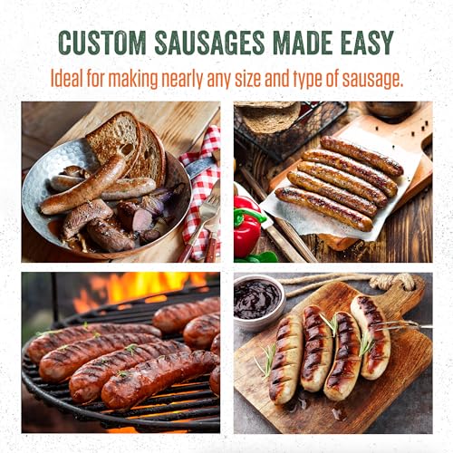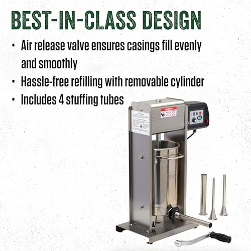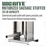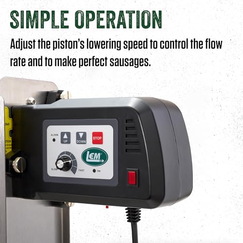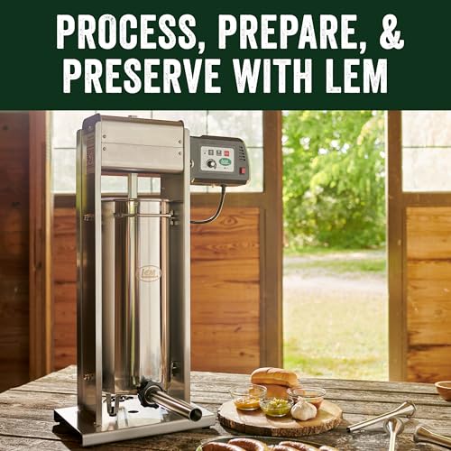 Upgrade your home food processing setup with a robust, commercial-grade stuffer made for seamless sausage-making. The LEM Products BigBite Motorized Sausage Stuffer is perfect for hunters, food processors, chefs, and culinary enthusiasts looking to create their own sausages. Designed to make sausage stuffing a one-person job, our motorized stuffers combine power, precision, and smart features to ensure a rewarding experience. The BigBite Motorized Stuffer offers a speed control knob, allowing you to adjust the piston’s lowering speed and control the flow rate into the casing. This feature is essential when making small sausages and snack sticks. The included footswitch frees up your hands for easy operation, while the auto-up and flow-stop functionalities make stuffing even more convenient. Our sausage stuffer also has an air release valve, ensuring casings fill evenly and smoothly with fewer air pockets. The removable cylinder allows for hassle-free refilling, and the stuffer comes with four stuffing tubes to accommodate various sausage sizes and types, including snack sticks (1/2″, 5/8″, 1″ 1/1/4″ OD). A crank handle is also included for non-motorized use. Select from three sizes – 10 lb., 20 lb., and 30 lb. – each representing the cylinder capacity.