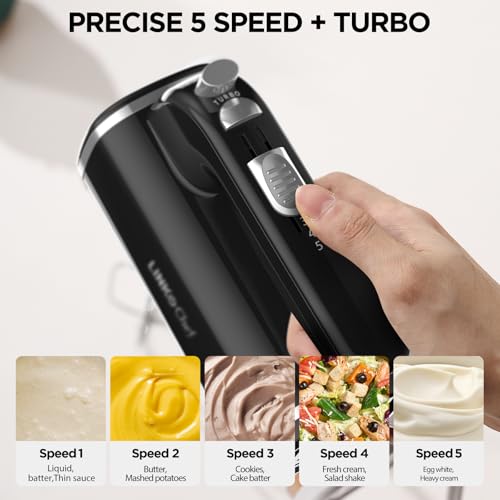 【5 SPEEDS AND TURBO BOOST】: The LinkChef electric mixer is equipped with a 450W motor and 5 different speeds, making it the ideal choice for new chefs. Use low speed for mixing dry ingredients with liquids, medium speed for combining cake flour, puddings, or batters, and high speed for whipping cream, egg whites, or thick dough. The turbo button provides quick and efficient blending when you need extra power.