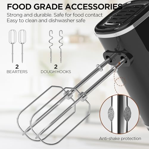 【ONE BUTTON EJECT】: The manual food mixer is supplied with food-grade stainless steel beaters and dough hooks, which are dishwasher-safe. Ensure the speed control is set to “0” position, then simply press the button for quick release and easy cleanup.