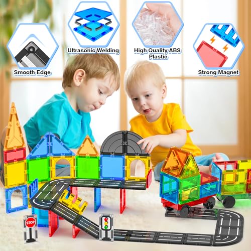Home Toys Magnetic Tiles Road Sets with Car, Magnetic Building Blocks Toys for 3+ Year Old Boys Girls, Montessori Magnet Kids Toys, Construction Toys for Ages 3 4 5 6 7 8 Christmas Birthday Gifts for Toddlers