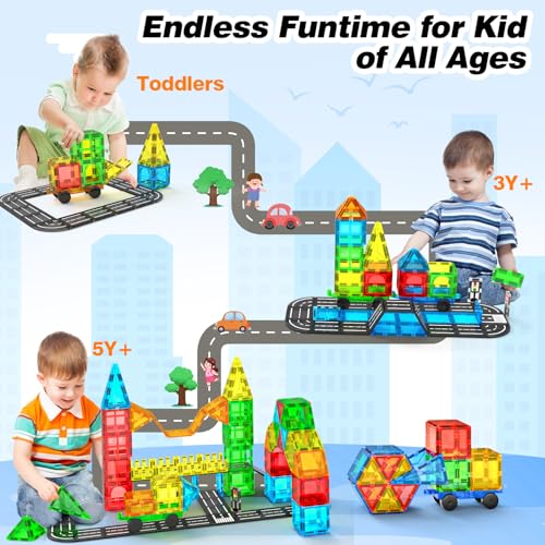 Magnetic Tiles Road Sets with Car, Magnetic Building Blocks Toys for 3+ Year Old Boys Girls, Montessori Magnet Kids Toys, Construction Toys for Ages 3 4 5 6 7 8 Christmas Birthday Gifts for Toddlers