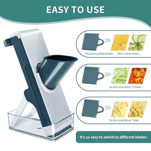 • Adjustable Vegetable Chopper: Equipped with interchangeable blades and a versatile cutting platform offering sizes from 2mm to 7mm, this vegetable slicer grater also functions as a convenient vegetable chopper. Effortlessly chop, slice, julienne, and dice a wide range of vegetables, simplifying your meal preparation.