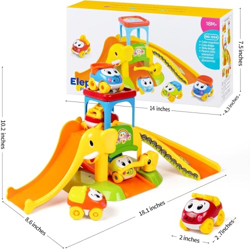 【Cute Elephant Theme Perfect Gifts】: This pretend play adorable elephant theme is a parking, slide, and assembly toy that integrates multiple functions in one, which is fun for kids to play because of such high playability. Ideal baby car toys 1st first 1+ 16 months 2-4 yr yo year old birthday, Xmas, Christmas gifts.