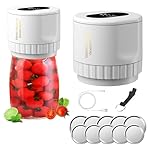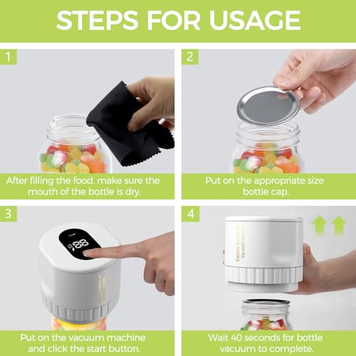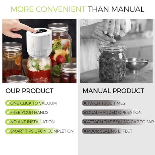 1.EASY TO USE Mason Jar Sealer- Simply set the vacuum sealer on the jar with sealing lid, press the button and wait 20-40 seconds to eliminate air. (The machine automatically pauses whenafter 180 seconds of continuous operation)