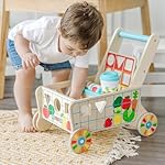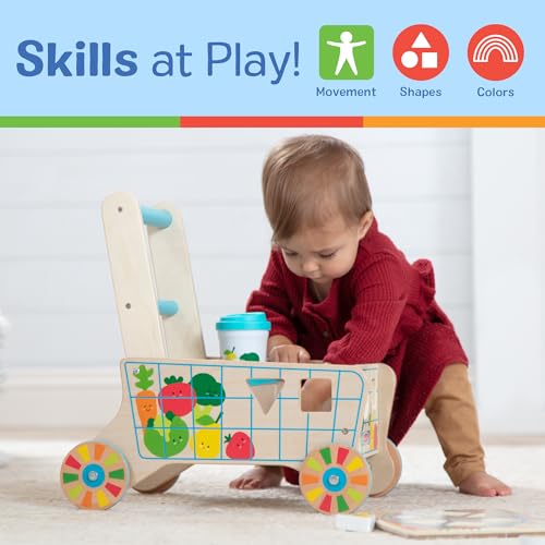 Explore shapes, colors, problem-solving, imaginative play, and more with this sturdy wooden grocery cart push toy with wooden shape-sorting and chunky puzzle pieces