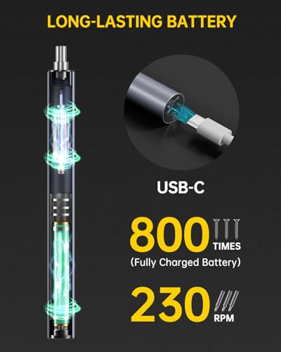 More Powerful: Cordless screwdriver powered by 650mAh rechargeable lithium battery, it only takes rechargeable small electric screwdriver 30-50 minutes. Equipped with a powerful motor providing a higher load carrying capacity at a no-load speed of 230 RPM, this electric mini screwdriver offers efficient fastening performance to save you time and effort.
