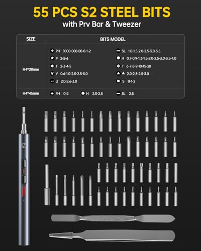 55-in-1 Metal Bits: QDOLXN electric screwdriver set has 55 different types of S2 steel bits available in H4*28MM and H4*45MM models. S2 material is safer to use, not easy to damage, and has a longer life, so that you can use different bit types to freely combine convenient work and be more professional.