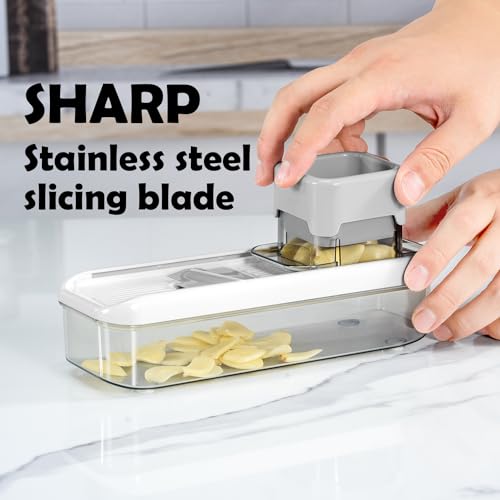 • MULTI-FUNCTIONAL MANDOLINE SLICER: This mini garlic slicer is equipped with 3 sharp stainless steel blades including a slicing blade, a shredding blade and a grinding blade, which is perfect for garlic, ginger, cucumber, carrot, lemon and more.