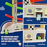 Unique Car Ramp Toy Set: Rather than common ramp racer toys with only 1 parking lot and few slides, our race car track toy for 2 year old boy and girl is specially designed with 2 parking lots, 6 bright colored ramps and 3 garages (a gas station, a repair shop, an auto detailing studio), which simulates real-life traffic situation. Little racing drivers enjoy the visual sense and the thrill of racing!