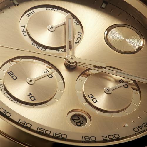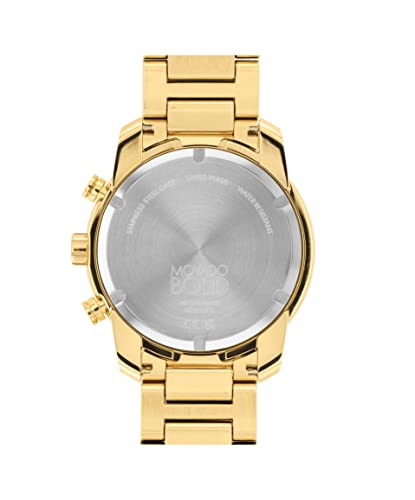 - RESILIENT DESIGN: Movado BOLD Verso Chronograph, 44 mm yellow gold ion-plated stainless steel case and bracelet with tachymeter scale. Features a yellow gold chronograph dial, Swiss Super-LumiNova accents, and date window detailing.