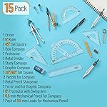 - Package Includes 15 Piece: 2 Metal Compasses (1 Study Compass & 1 Graphic Compass), 1 Extra Lead for Graphic Compass, 1 Metal Divider, 2 Pencils for Compass, 1 Mechanical Pencil (0.5 mm) for Compass, 1 Pack of 0.5 mm Lead for Mechanical Pencil, 1 Eraser, 1 Metal Pencil Sharpener, 1 Ruler (6”), 1 Set Square (30°/60°), 1 Set Square (45°), 1 Protractor, 1 Protractor with Swing Arm (6”)