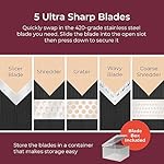 • Includes 5× Blades – Blades evenly cut onions, cucumbers, sweet potatoes, apples, and more. Use as a cheese slicer, grater and as a julienne shredder.