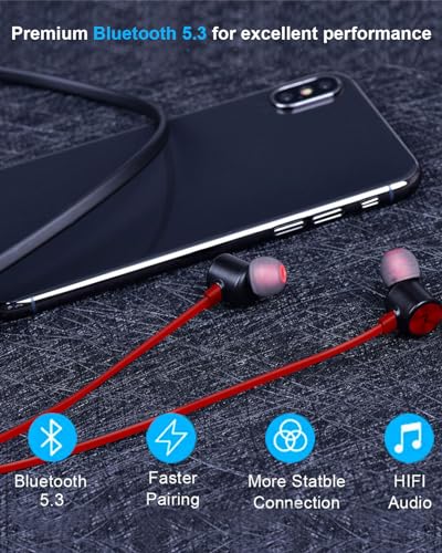 NANAMI Bluetooth Earbuds, 5.3 Bluetooth Wireless Headphones, IPX7 Waterproof, in-Ear Earphones with Mic, Noise Cancelling Headsets, Magnetic Neckband, 18 Hours Playtime for Gym, Sports (Red with Red)