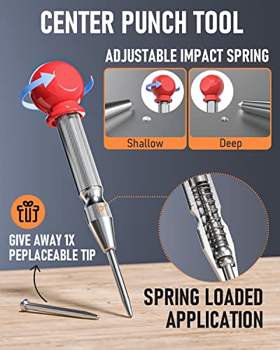 Various Carpenter Tools For Wide Use: With a Metal Carbide Scribe Tool, which is easy to carve on hard material such as metal, tile, glass, ceramics, wood and more. A Spring Loaded Center Punch can be operated with one hand and accurately mark a centering spot for drilling holes