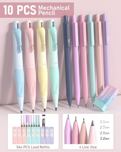 10 Pcs Mechanical Pencil: This set includes 6 mechanical pencils 0.5mm, 0.7mm, 0.9mm and 4 Pcs mechanical pencil 2.0mm. The ergonomic triangular grip for comfortable hold, the lead is super strong, smooth, produces a clear dark line. 4 line sizes offer versatility for different writing or drawing tasks