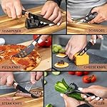 COMPREHENSIVE TOOLSET: This set is not just about knives; it’s a complete kitchen toolset. In addition to the 17 knives, it includes essential accessories such as a knife sharpener, peeler, and scissors. The knife sharpener ensures that your blades stay sharp for precise cutting every time. The peeler and scissors make food preparation a breeze, while the specialized pizza knife and cheese knife add versatility to your culinary adventures.