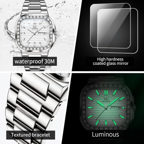 Home Wristwatches OLEVS Mens Tank Watch Minimalist Diamond Watch Fashion Dress Analog Quartz Mens Watches Rectangular Waterproof Stainless Steel Luminous with Date Watches for Men(Silver/Rose Gold)