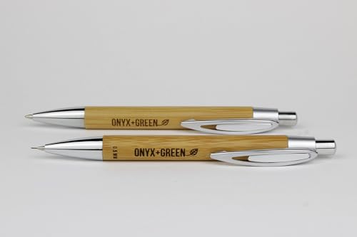 This Pen and Mechanical Pencil set from Onyx & Blue includes one pen with black ink and one .7 mm lead mechanical pencil. Both items are made rom Bamboo and come in recycled Kraft free packaging with soy-based ink.