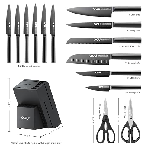 【PERFECT QUALITY KNIFE SET】 OOU 15 piece Knife Set includes:7″ chef knife, 7″ santoku knife, 8″ slicing knife, 8″ serrated bread knife, 5″ utility knife, 3.5″ paring knife, 6 PCS of 4.5″ serrated steak knives, kitchen shears, utility shears, and hard wood knife block with built-in sharpener.This knife set can be used for your daily kitchen tasks and fit all your needs.