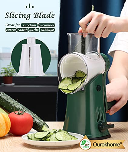 Ourokhome Rotary Cheese Grater Shredder, Multifunction 5 in 1 Kitchen Manual Speed Round Mandolin Food Slicer Vegetable Shooter Potato Hashbrown Grinder for Nut, Carrot, Radish, Cucumber, Green