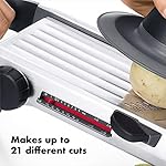 OXO steel user-friendly mandoline is the perfect tool for creating culinary sensations quickly and easily. Straight, serrated and two different wavy blades can be set to any slice thickness and are ideal for making cucumber salad, potato chips, onion rings, waffle fries and citrus slices. Try making French fries, carrot sticks and garnishes with the thin and thick julienne blades. Just turn the soft dial to select your slice thickness or julienne setting. All blades are safely covered when not in use. A soft handle set lower than the body ensures a comfortable grip and keeps your hand out of the way, and wide, non-slip feet keep the mandoline stable and secure on the countertop. The large food holder holds food securely, protects fingers and has a soft grip for added Comfort. Storage is a snap: all blades store on board or in a compact box and the legs fold compactly. All blades are easily removable for cleaning.