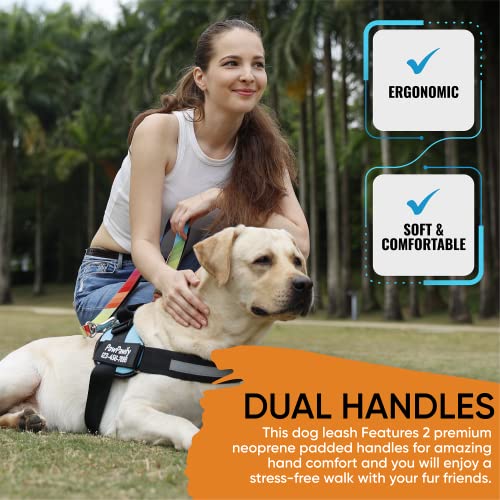 COMFORTABLE AND DURABLE: To reduce discomfort, the lead features two ergonomic padded handles crafted from premium neoprene. With tight stitching to prevent tears and fraying, the extra-strong nylon material is ideal for small and large dogs alike.