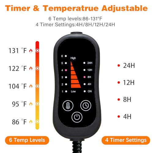 Adjustable Temperature & Smart Timer Function: The cat heating pad has 6 levels of adjustable temp (from 86℉ to 131℉) to meet your pet’s individual comfort needs. With humanized design, this heated cat bed will be automatically powered off after the setting time arrives(4h/8h/12h/24h/always on).