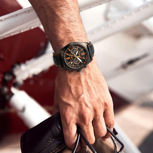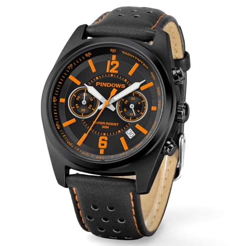 PINDOWS Watches for Men, Men Multifunction Chronograph Fashion Business Casual Quartz Wristwatches with Black Brown Leather Strap