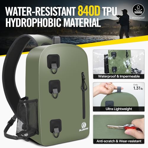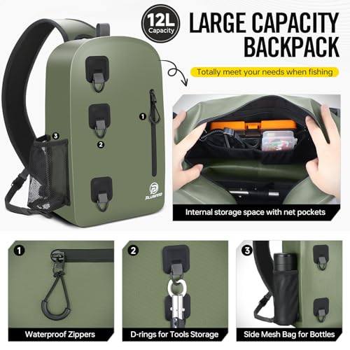 PLUSINNO Waterproof Fishing Backpack, 12L Fishing Sling Bag, Fishing Tackle Bag with Waterproof Zippers for Fishing, Kayaking