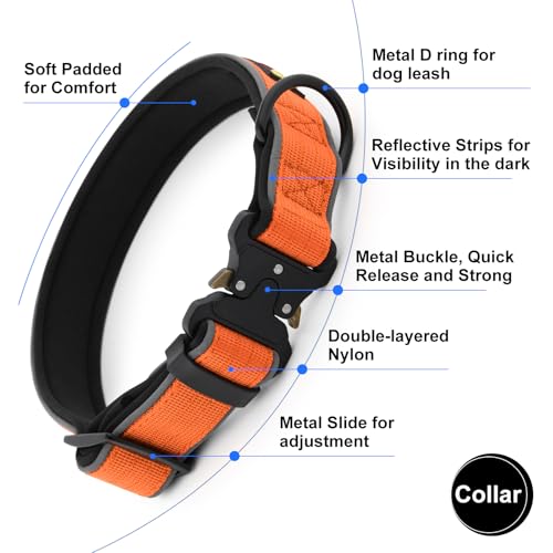 Plutus Pet Tactical Dog Collar, Reflective, Adjustable Heavy Duty Dog Collar, Soft Padded and Comfortable, for Small Medium and Large Dogs (Orange, L)