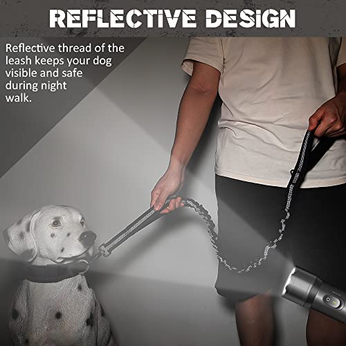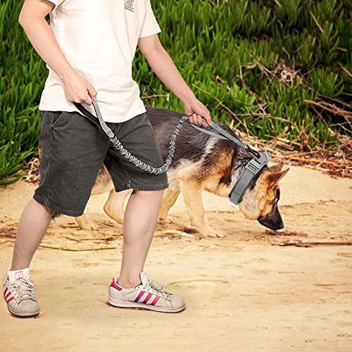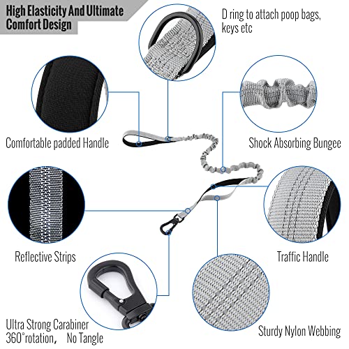 【Heavy Duty Metal Buckle】The dog collar has a quick release heavy-duty metal buckle that makes it hard to break, ensuring most safety of your dog. The shock-absorbing bungee leash has an elastic rubber band inside, so that the leash can extend from 48” to 62” to provide sufficient space. Moreover, the bungee can reduce injury risk by absorbing the stress and muscle strain for both you and your dog.