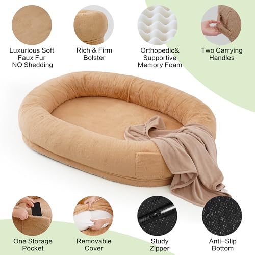 Super comfortable for human pet snuggle time: MERITLIFE fluffy lage human dog bed for adult is crafted with premium breathable 3D air faux fur.This fabric feels very cozy-soft and comfortable to touch,which do not shed compared with other human sized dog bed.Bottom is made of orthopedic and supportive memory foam.NO weird smell.Super versatile between dogs and human people.Great present for your family, children,dog or pet lover,multiple dogs,giant pups,doggie,all furry friends,grandkids.