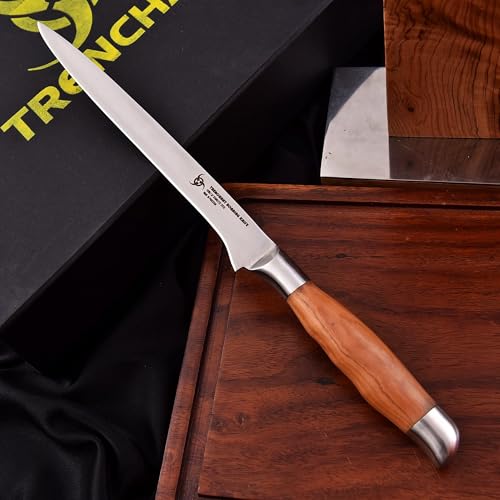 Custom-Crafted Premium Kitchen Knife Set – A Masterpiece of Design & Precision This exclusive kitchen knife set represents the pinnacle of craftsmanship, taking 10 months of meticulous design and hand-finishing to bring to life. Every element was carefully considered, using the finest materials and expert techniques to create a luxury kitchen toolset that blends aesthetics, durability, and functionality. With a total of 6 essential knives and a custom magnetic olive wood block, this set is designed for both professional chefs and home cooks who demand the best. Exquisite Craftsmanship and Materials: Blades, Bolster, and Butt: Crafted from high-quality 420C stainless steel, known for its superior edge retention and resistance to corrosion. Each blade is tempered to an HRC value between 60-64, ensuring razor-sharp performance and long-lasting sharpness. Handles: The handles are made from premium olive wood, prized for its natural patterns and beautiful grain. This wood offers not only visual elegance but also a comfortable grip, making these knives a joy to use. Magnetic Olive Wood Block: The set includes a handcrafted olive wood magnetic block, perfectly matching the handles for a seamless, unified look. The block features an internal magnet mechanism that holds the knives firmly in place, while its elegant design adds sophistication to any kitchen. What’s Included: Bread Knife (15 inches | 9″ blade, 6″ handle) Serrated blade edge ideal for effortlessly slicing through crusty loaves without crushing the interior. Chef’s Knife (15 inches | 9″ blade, 6″ handle) Broad blade with a smooth edge and precision heel the perfect multi-purpose knife for chopping, dicing, and slicing. Santoku Knife (15 inches | 9″ blade, 6″ handle) Wide blade with hollow-edge dimples prevents food from sticking and ensures precise, clean cuts for vegetables and meats. Boning/Fillet Knife (15 inches | 9″ blade, 6″ handle) Narrow, flexible blade—ideal for filleting fish or deboning poultry with precision and ease. Utility Knife (10 inches | 6″ blade, 4″ handle) Versatile blade perfect for smaller tasks like trimming herbs or slicing fruits and vegetables. Steak Knife (8 inches | 4.5″ blade, 3.5″ handle) Sharp blade—designed for smooth, effortless cutting through cooked meats without tearing. Luxury Presentation & Packaging: This set comes packaged in a premium rigid box, embossed with the Trenchant logo. Inside, the box features a two-layer custom interior lined with foam and velvet: Top Layer: Securely holds the knives in place. Bottom Layer: Contains the unassembled magnetic olive wood block. Simply fasten the screws upon unpackaging to complete the setup. Care Instructions: Handle with care: The knives feature razor-sharp edges; keep them away from your body to avoid injury. Heavyweight Design: Both the knives and magnetic block are substantial. Do not lift the block with knives attached—remove the knives first. Relocating the Block: To move the block, slide each knife upward to remove it, relocate the block, and reattach the knives by sliding them down onto the magnet. Maintenance: Clean the blades by hand with mild detergent; avoid dishwashers to preserve the olive wood handles. Store knives only in the block to prevent damage to the edges. Key Features: Blade Material: 420C Stainless Steel Handle Material: Premium Olive Wood Full Tang Construction: Yes Magnetic Block Material: Olive Wood Tempered HRC Value: 60-64 Finish: Matte Packaging: Rigid box with foam and velvet interior This custom-crafted kitchen knife set is more than just a collection of tools, it’s an investment in quality, elegance, and performance. Designed for those who appreciate fine craftsmanship, the combination of steel precision, natural olive wood, and ergonomic design makes this set a standout piece for any kitchen. Whether for personal use or as a luxurious gift, this set is priced to reflect its unmatched quality and will elevate your cooking experience.