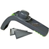 The sleek design of the PrepWorks by Progressive Folding Mandolin Slicer features three slicing thicknesses and a french fry cut. Simply pop the interchangeable plates into place to adjust the slicing thickness or julienne cut. The spring-loaded lever safely pops the adjustable plates out while the thickness plates store on top and pop in or out both easily and safely. This Mandolin Slicer has extra-sharp, electro polished Japanese Stainless Steel blades and is dishwasher safe.
