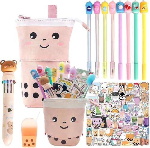 Primo Lines Kawaii Pencil Case and Complete 61 PCS Pink Stationary Set with Pop Up Cute Boba Case, 8 Pens, 50 Bubble Tea Stickers, Multi Color Pen For School Supplies