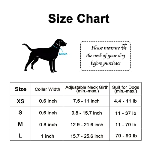 Showing Pictures: All pictures are taken with our production samples from a size of Medium (Width 4/5″, Neck 12.9″-21.6″). Please measure your pets carefully to make a safe and fit purchase. Always look at the size chart for the recommended neck girth and weight range to confirm the size.