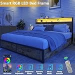 - 【RGB LED Light Bed Frame】This Bed frame is equipped with RGB LED light belt, you can use the equipped remote control or mobile APP to set the LED color, brightness, mode, timing function, etc., to meet the needs of different styles and different scenes, make your home life more colorful. The LED function comes with detailed instructions, and you can follow the instructions to complete the corresponding settings.