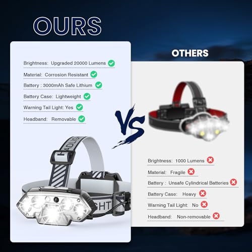 Illuminate Your World: Designed in the USA, Experience unrivaled brightness with our unique lighting technology that produces an impressive 22000 lumens! Equipped with advanced XPE, XPG and LED bulbs, our head lamp reaches up to 1000 feet, providing unparalleled illumination for your adventures. Perfect for exploring caves, night running,cycling,hunting,fishing,camping gear, construction work and other outdoor adventure activities